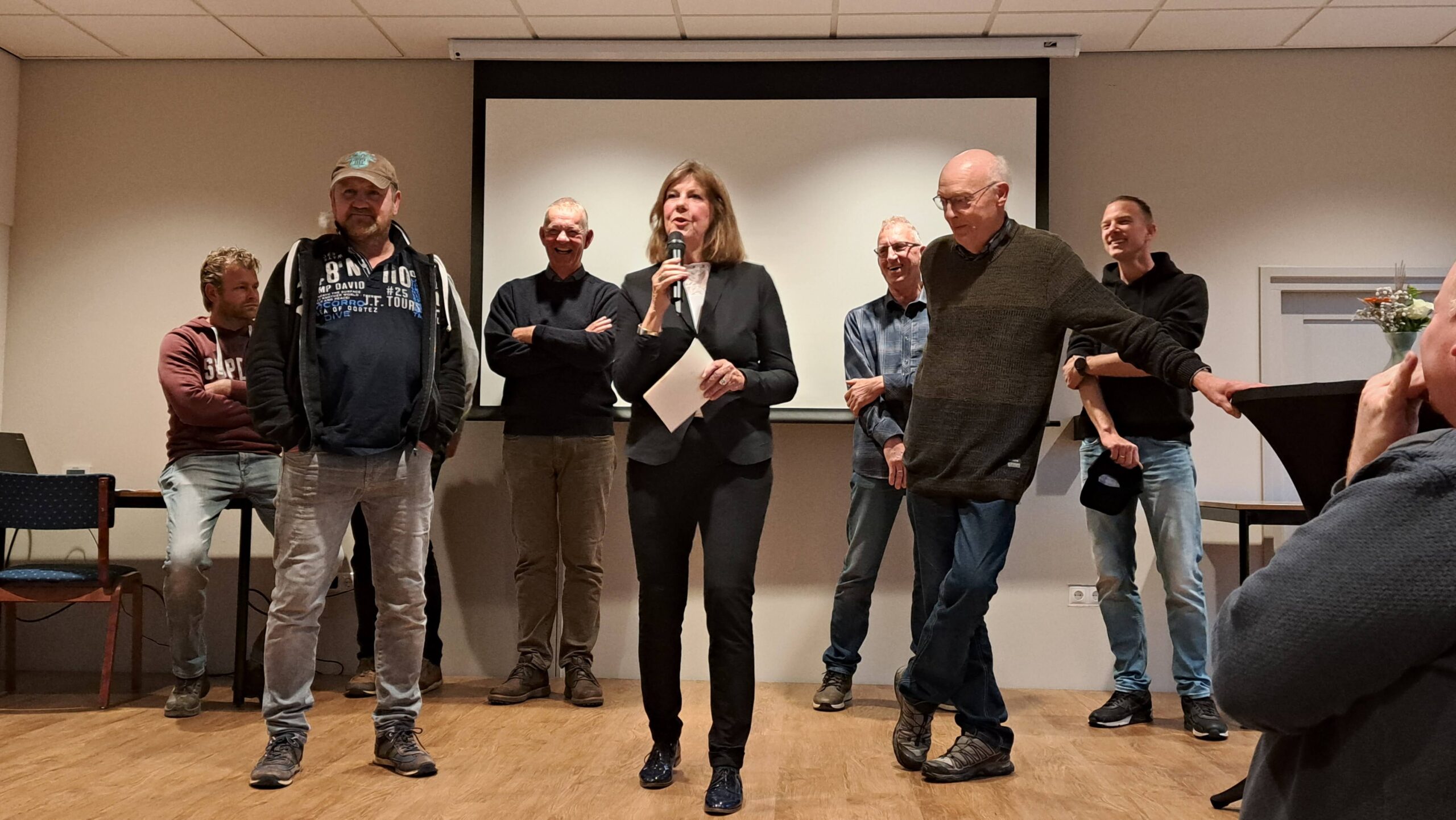 Ze vraagt verschillende vrijwilligers op het podium en er volgen leuke korte interviews met veel humor en gelach. Wat fragmenten; Zo zegt Anne van Agricola Bouw met een flinke knipoog dat ie het “verschrikkelijk” vond met al die bouwvrijwilligers te moeten samenwerken, Darren wijst er nogmaals op dat schilderwerk glad en strak hoort te zijn en als Gerlof binnenkomt weet je precies hoe laat het is; 10.00 uur aan de slag, 12.00 uur etenstijd. Klaas Terpstra vindt zijn vele timmerwerk vanzelfsprekend, zoiets doe je voor het dorp en Klaas Brouwer pakt z’n oude beroep van installateur weer op en leert daarbij veel van de man met de 3 petten, Hindrik (vrijwilliger, installateur èn bestuurslid). Architect Hylke geeft ruiterlijk toe mooie plaatjes van het dorpshuis te gaan gebruiken ter promotie van z’n werk en Eddy van Doarpswurk heeft er vanaf het begin alle vertrouwen in gehad dat dit project in Gaastmeer ging lukken, Ande van de interieurcommissie weet haarfijn uit te leggen waar “Mar, o mar” op de foto in de hal voor staat en logistiek manager Hidde vliegt voor een doosje schroeven.