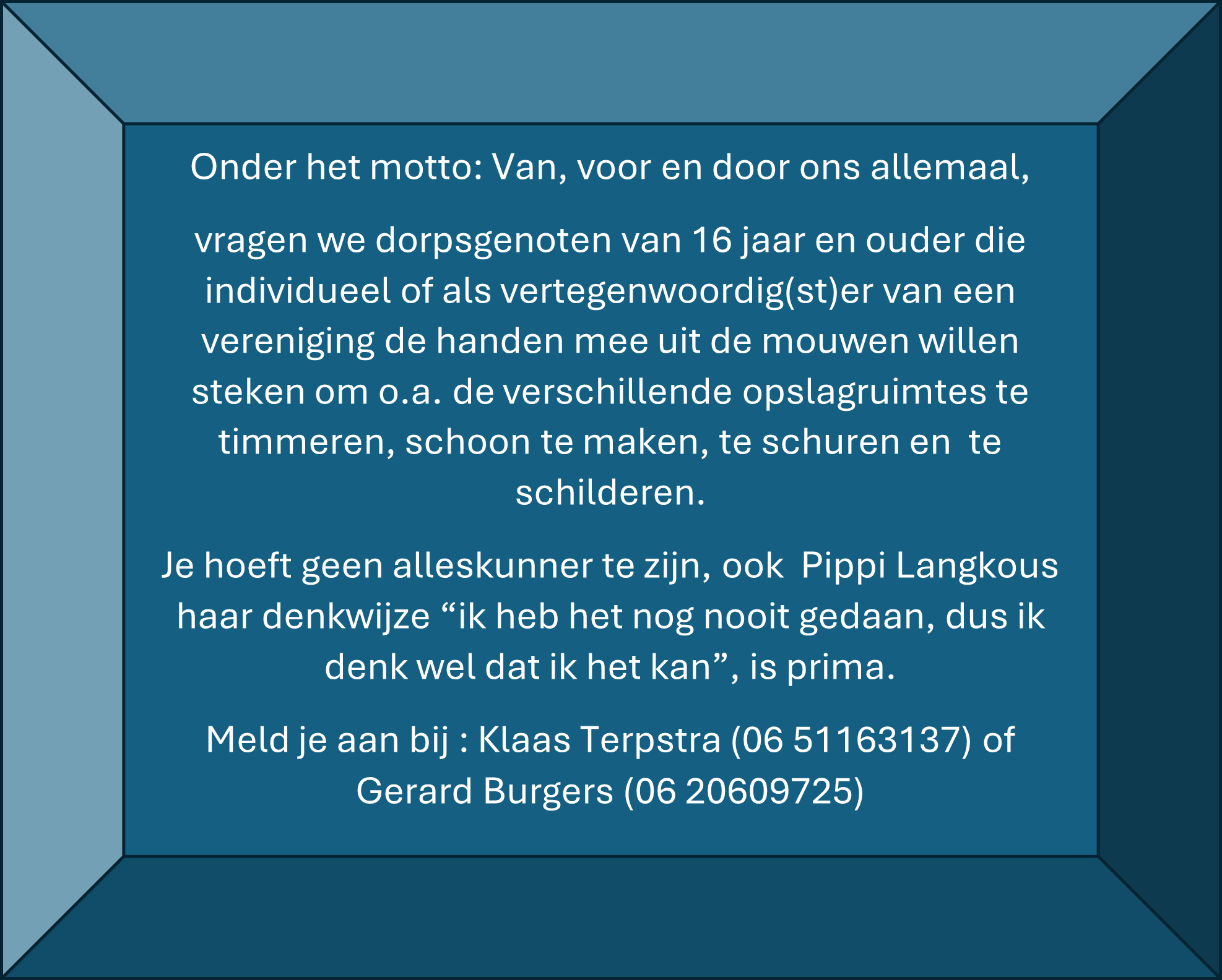 De zolder ondergaat eveneens een grote metamorfose, want o.l.v. Klaas Terpstra wordt met een aantal meedenkende-en werkende vrijwilligers de zolder volledig heringericht, zodat er voor de verenigingen diverse opslagruimtes en een prachtige overlegkamer ontstaat. Geweldig dat dit “gewoon” wordt opgepakt, maar dit gaat natuurlijk allemaal niet vanzelf en daarom doen deze ouwe rotten samen met Stichting Dorpshuis een dringende oproep:
